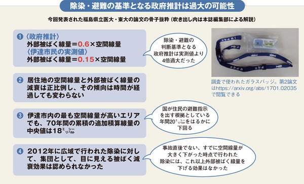 昨年12月6日。こうして集まったデータを、個人情報を消したビッグデータ化した上で分析した、宮崎真・福島県立医科大学助手と、早野龍五・東京大学教授の共著による英語論文が、英国の放射線関連の論文サイト、Journal of Radiological Protectionに掲載された。専門論文のサイトでありながら全世界で2万4000以上ものダウンロード数を記録したこの論文で分かったのは、「これまで政府が除染・住民避難の根拠としてきた外部被ばく線量は、実態よりかなり大きく見積もられていた」ということだ。