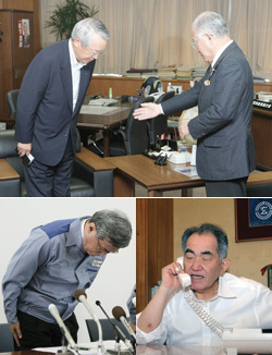 やらせメール問題で国に謝罪した眞部利應・九州電力社長(左上)と玄海原発の再稼動の同意を撤回する岸本英雄・玄海町長(右下)。会見で節電要請した八木誠・関西電力社長(左下)Photo:JIJI