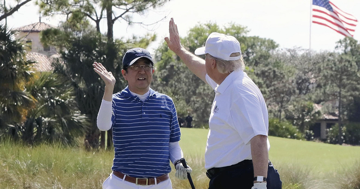 トランプ米大統領はゴルフ好きで知られ、11月の来日時には、安倍首相とプロゴルファーの松山英樹選手とプレーした Photo:内閣広報室提供/JIJI