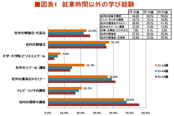 調べてみると、2割強の人が、参加したことがあると回答している(図表1)。セミナーへの参加などに比べれば低いが、大学院やビジネススクールに比べればはるかに多く、スクールや講座をも上回っている。