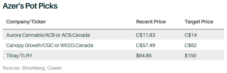 • ウォール街で大麻関連企業のアナリストはほとんどいない• ウォール街で大麻関連企業のアナリストはほとんどいないビビアン・エイザー氏は、個人が楽しむために使うマリフアナ(大麻)がカナダで合法化された2016年に、カウエン・アンド・カンパニーで大麻関連事業のリサーチを開始した。現在でもウォール街で大麻をカバーしているアナリストはほとんどいない。同氏は、カナダの医療用大麻の製造会社、オーロラ・カナビス(ACB)、キャノピー・グロース(CGC)、ティルレイ(TLRY)の3銘柄を選好している。本誌:大麻会社の前はどのセクターを担当していたか?