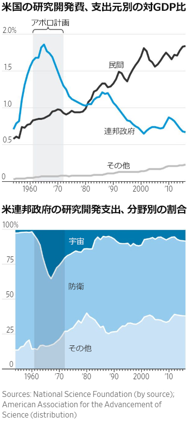 「もし月に人間を送りこむことができれば…」アポロ11号は過去50年間、米国が本気で取り組めば――もちろん資金もつぎ込めば――実現できることの典型例とされてきた。アポロ宇宙計画は、連邦政府こそが大きな課題を解決できるし解決すべきだと米国民が当然のように考えていた時代の絶頂期を象徴するものだった。同計画の費用は250億ドルに上った。これは国内総生産(GDP)に対する比率からすると現在の6000億ドル(約64兆9000億円)に相当する。米国がこれほど野心的または費用の掛かるプロジェクトに取り組んだことは、その後ない。今でも米国人はリスクを取って問題を解決しているが、政府がそうすることを期待してはいない。国内で研究開発(R&D)に投じられた資金の対GDP比は、データが入手可能な最新年である2015年には2.7%だった。これは1966年と同じである。しかし当時、宇宙開発競争と冷戦のさなかにあった政府が投じたR&D費は民間企業の倍だった。現在では民間企業のR&D支出が連邦政府の3倍になっている。今ではリスクを取ることやイノベーションは、ムーンショット(月ロケット打ち上げのような壮大な構想)でなはく、ベンチャーキャピタリスト、医薬品研究所、インターネット起業家と同義ととらえられている。彼らが追求するものは、発見や名声ではなく、主として富である。