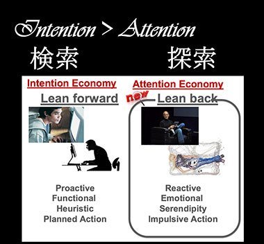 これはどういうことかというと、インターネットが前のめり(lean forward)になって使うものから、ソファにゆったりもたれかかりながら(lean back)使うものに変わってきた、ということなんです。その違いを端的に表しているのがパソコンとスマホの違いで、パソコンは電源を立ち上げるのも面倒くさいし、デスクの前に座らなければいけないから、どうしても「よっこらしょ」というインターネットなんです。そうすると、どうしても「これをやりたい」という目的があるときだけ使うものになってしまう。それに対して、スティーブ・ジョブズがiPadのプレゼンをしたときは、ソファに座りながらプレゼンをしていて、最初からゆったりダラダラ使うものだったわけです。