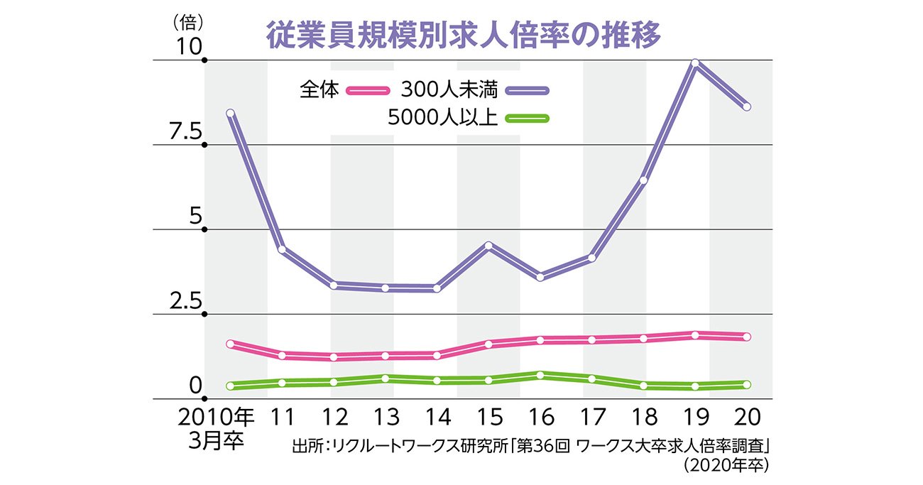 20年卒で比べてみると、大企業の求人倍率は0.42倍と、企業の求人数が求職者の人数の半分以下となっており狭き門であることが分かる。一方、中小企業の求人倍率は8.62倍と異常に高く、深刻な人手不足に陥っている。