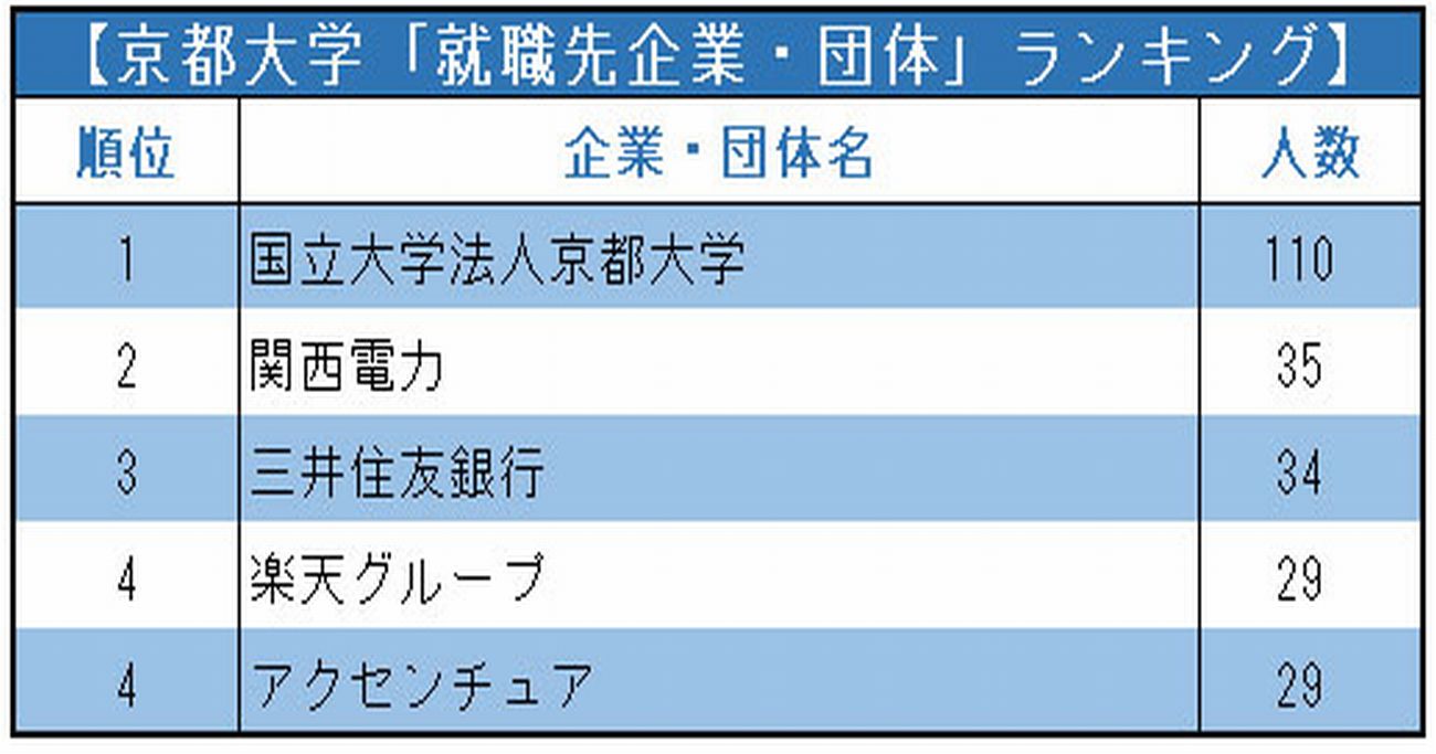 高度で独創的な研究で知られる京都大学。これまで、フィールズ賞、ガウス賞、ラスター賞、そして多くのノーベル賞受賞者を輩出している。東大が東の最難関なら、京大は名実ともに「西の最難関」である。そんな京大の学生たちは、どんなところに就職しているのか。