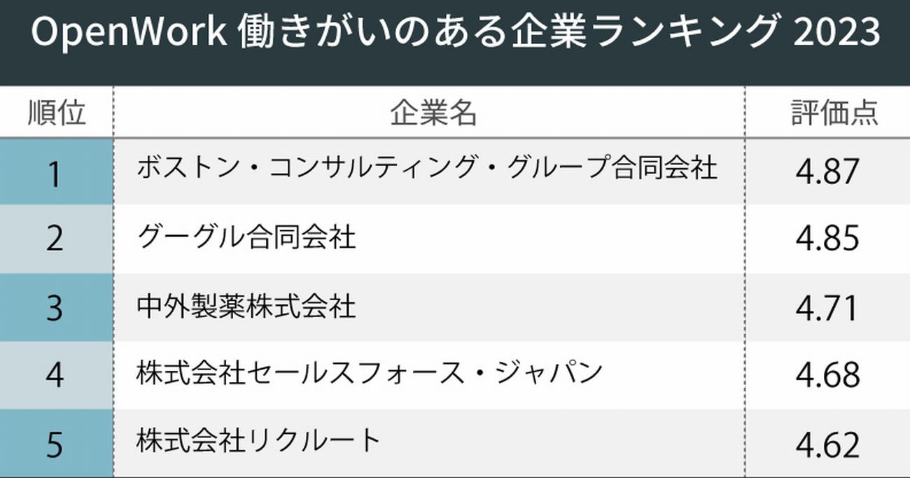 そんな24年卒の就活生にとって企業・業界分析の参考になるのが、先日発表された「社員が選ぶ『働きがいのある企業』ランキング 2023』である。就職・転職のためのジョブマーケット・プラットフォーム「OpenWork」を運営するオープンワーク株式会社が、同サイトに投稿された「社員・元社員による、働く環境に関する評価点」を集計し、社員の「働きがい」をランキング化したものだ。調査は今年で10回目となる。