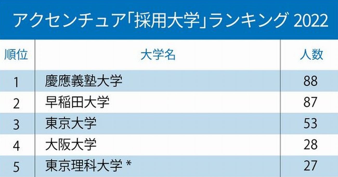 2021年はアクセンチュア、野村総研ともに採用大学ランキング1位は慶應義塾大学、2位は早稲田大学、3位は東京大学だった。