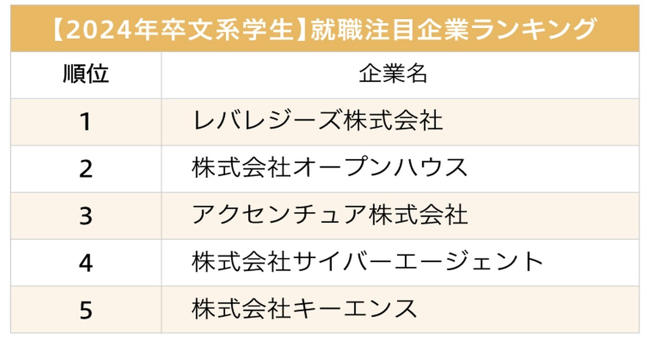 「文系学生が選ぶ、就職注目企業ランキング」のトップ3は、1位レバレジーズ、2位オープンハウス、3位アクセンチュアとなった。