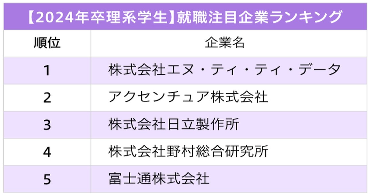 「理系学生が選ぶ、就職注目企業ランキング」のトップ3は、1位エヌ・ティ・ティ・データ、2位アクセンチュア、3位日立製作所となった。
