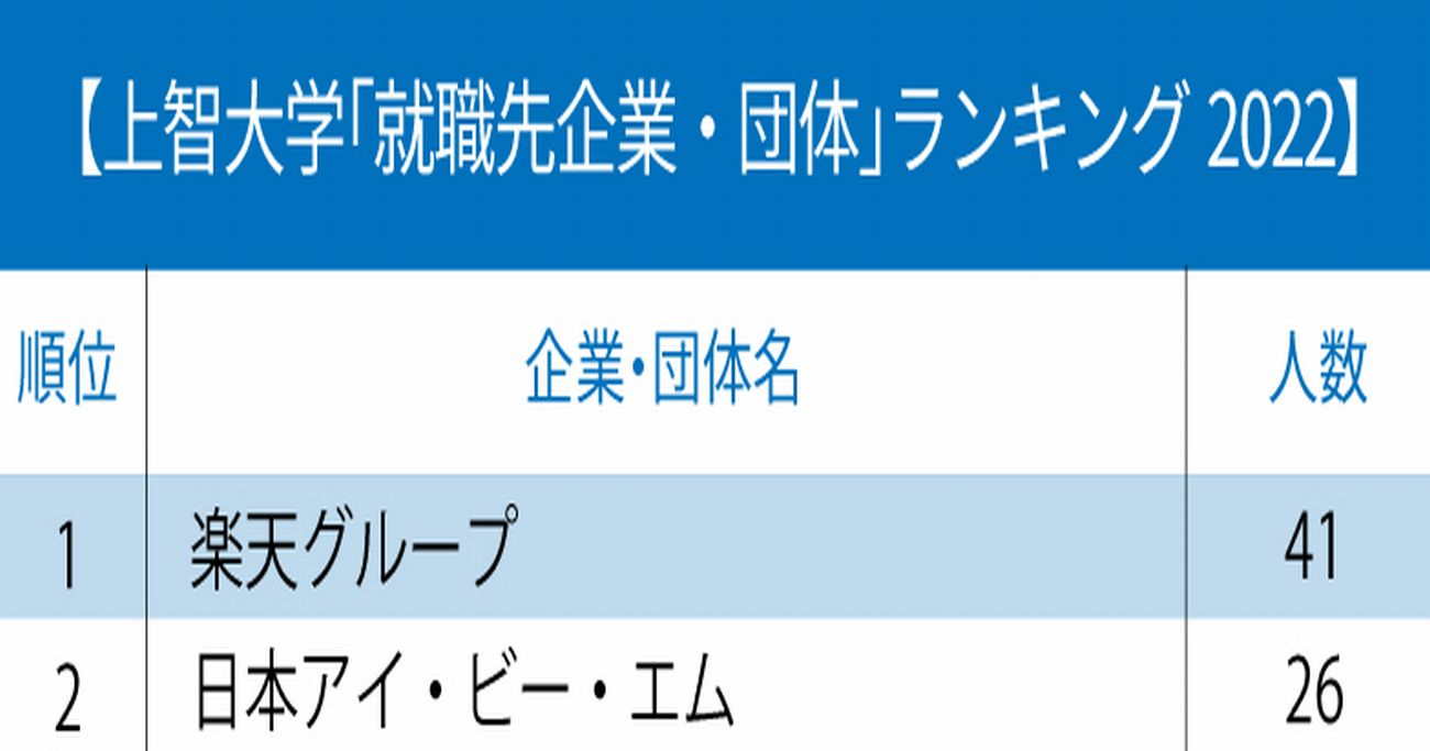 2021年の就職先1位は、上智大、青山学院大、立教大が楽天グループ、明治大が国家公務員一般職、中央大が東京都庁、法政大が富士ソフト、学習院大が東京23区特別区人事委員会、そして東京理科大が日立製作所となった。