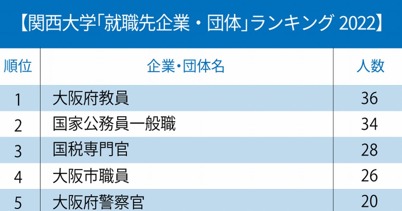まず関大で1位となったのは大阪府教員で、前年3位からのランクアップとなる。関大は官公庁への就職が多いことで知られるが、国家公務員一般職、国税専門官、大阪市職員、大阪府警察官と、トップ5までが全て公務員という結果は、壮観ともいえる。