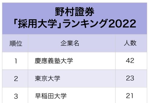 そんな証券業界を代表する大手2社の2021年の「採用大学」ランキングを見ると、野村證券1位は慶應義塾大学、大和証券グループ(持株会社は大和証券グループ本社)1位は早稲田大学となった。トップ3は、いずれも東大と早慶の卒業生で占められている。