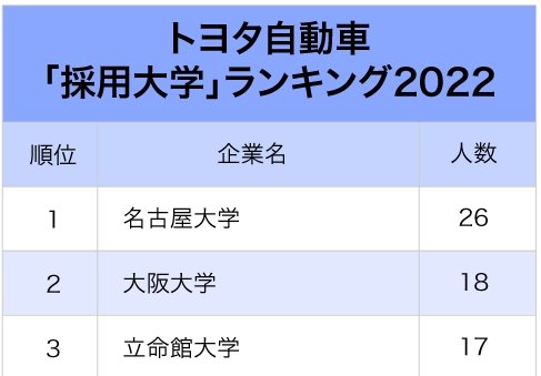 そんな3大自動車メーカーの21年の「採用大学」ランキングを見ると、トヨタの採用数1位は名古屋大学、ホンダの1位は早稲田大学、日産の1位は九州大学となった(職種の内訳や採用形態は不明)。