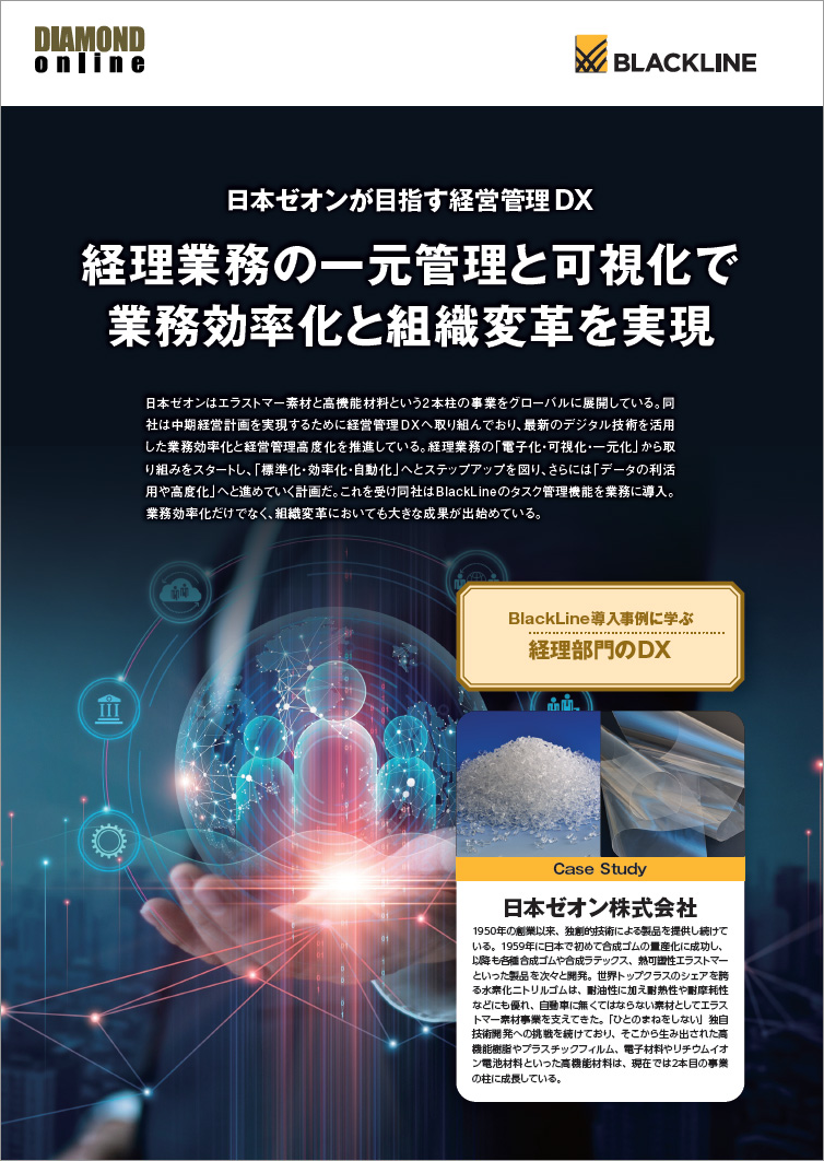 経営管理DXの推進に当たり日本ゼオンが注目したのが、経理業務変革プラットフォームであるBlackLineの導入である。一般的に、新しいツールの導入には抵抗やバラツキが生じるものだが、同社は導入決定からわずか5カ月後に本番稼働までこぎ着け、業務時間の約10%削減に成功した。本資料では日本ゼオンが短期間で導入に成功した理由、さらにはBlackLineによってもたらされた“思いがけない効果”も紹介する。経営管理DXでビジネス全体を変革していきたいと考える経営層や経理部門の担当者はぜひご一読いただきたい。