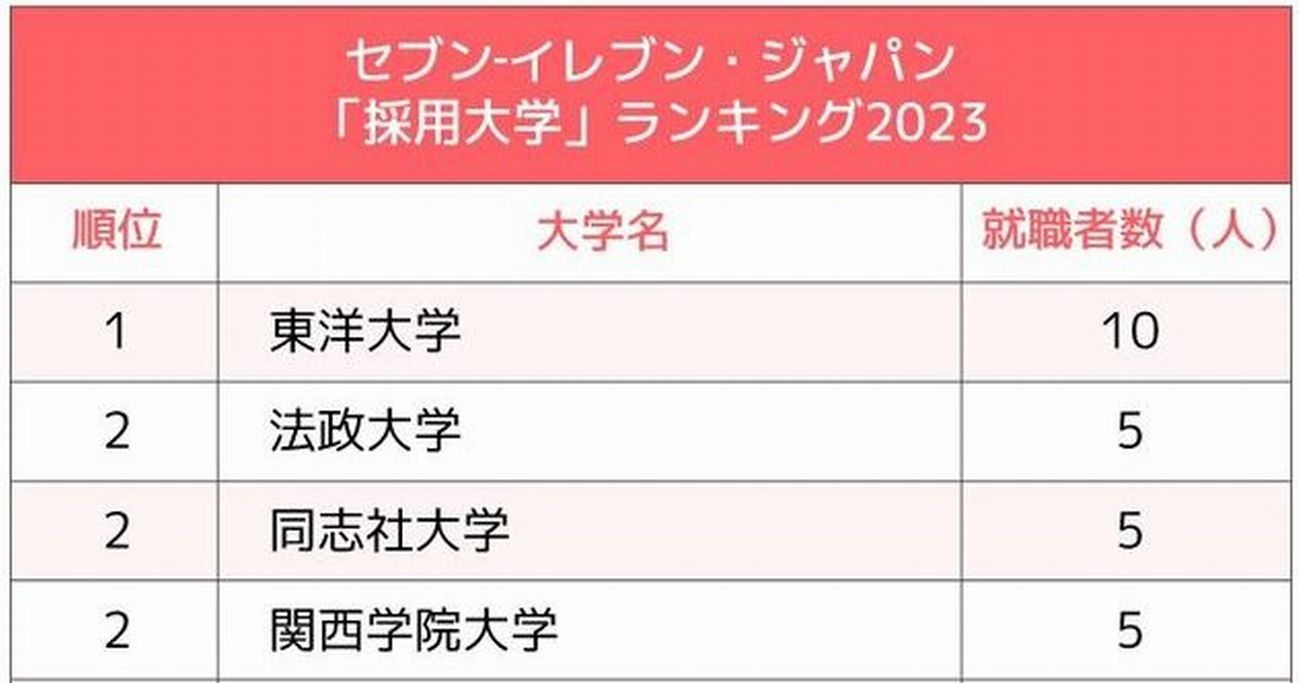 22年のコンビニ3社の採用大学ランキングでは、セブンは東洋大学が1位、早稲田大学と関西大学が2位で並んだ。ファミマは関西学院大学が1位、立命館大学が2位、創価大学と立教大学が3位。ローソンは、立命館大学が1位、中央大学と明治大学が並んで2位だった。