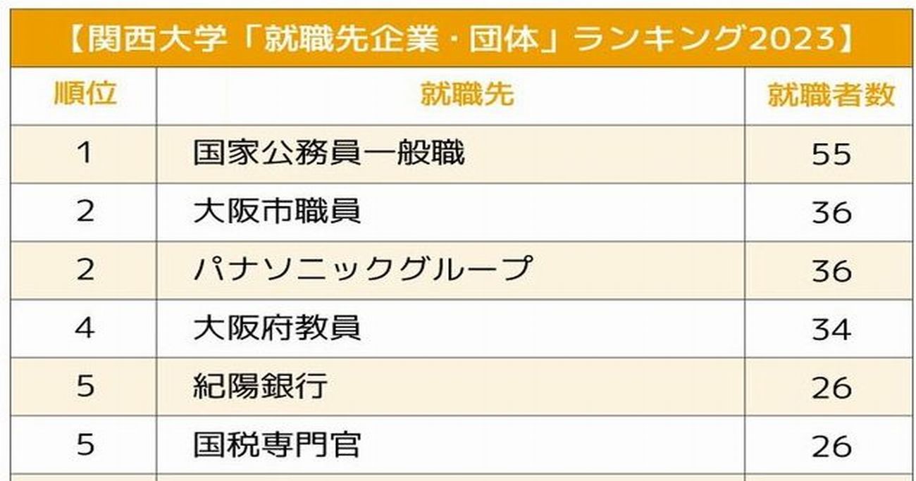 2022年の関関同立+近畿大「就職先企業・団体」ランキングの各大学の1位を振り返ってみよう。関西大は大阪府教員、関西学院大は国家公務員、同志社大は京都銀行、立命館大はパナソニック、近畿大は大阪府警察で、全体的に公務員志向が高かった。