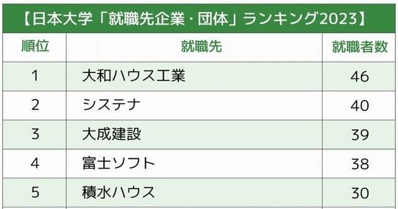 2022年の日本大学「就職先企業・団体」ランキングでは、1位は警視庁、2位はアウトソーシングテクノロジー、3位は東京都教育委員会だった。