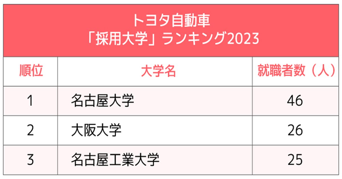 22年の3大自動車メーカーの採用大学ランキングを見ると、1位はトヨタ自動車が名古屋大学、ホンダ(本田技研工業)が早稲田大学、日産自動車が九州大学だった。