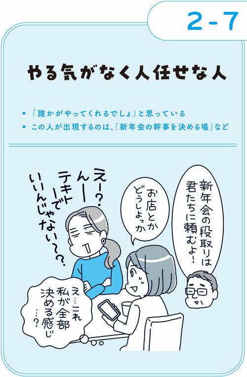「誰かがやってくれるでしょ」と思っている。この人が出現するのは、「新年会の幹事を決める場」など(同書より転載)。 イラスト・カツヤマケイコ