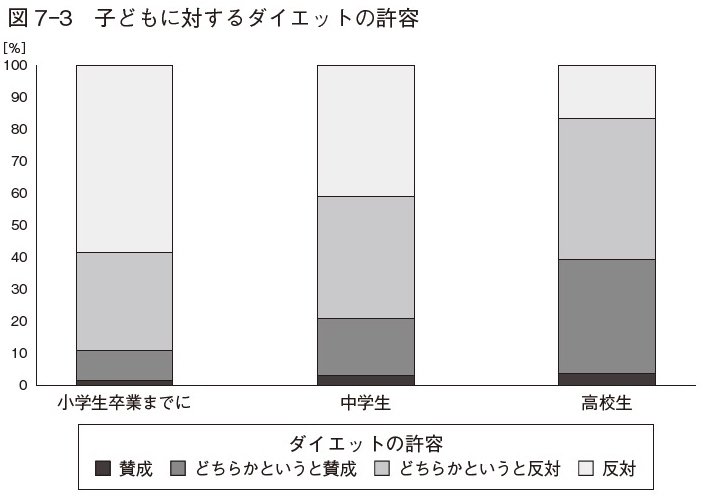 また、2018年の調査では扱わなかったダイエットの許容について、2024年の調査Bで扱ったので、それも見てみましょう(図7-3)。先ほどと同じ4件法で賛否の回答を求めていますが、「賛成」または「どちらかというと賛成」の割合は、小学生卒業までで10.9%、中学生で20.7%、高校生で39.4%となっています(注5)。体毛処理よりは賛成していないようです。