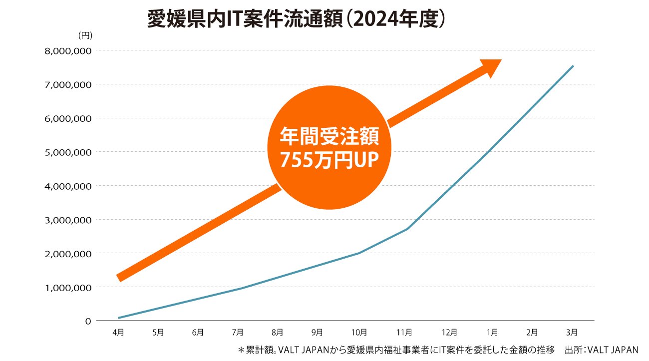 VALT JAPANは2023年度から、愛媛県内の福祉事業所でDX(デジタルトランスフォーメーション)化の推進を進めてきた。24年度からは新規事業所にパソコン(PC)を貸与し、職員やワーカーが実際にIT環境に慣れる機会を設けた。また、基本的なPCタイピングやファイル管理、クラウドツールの活用法を学ぶ研修を実施し、基盤となるITスキルを育んできた。さらに実際の案件を通じて学ぶOJTを導入し、知識を実務に生かしながら定着させる仕組みを整えた。