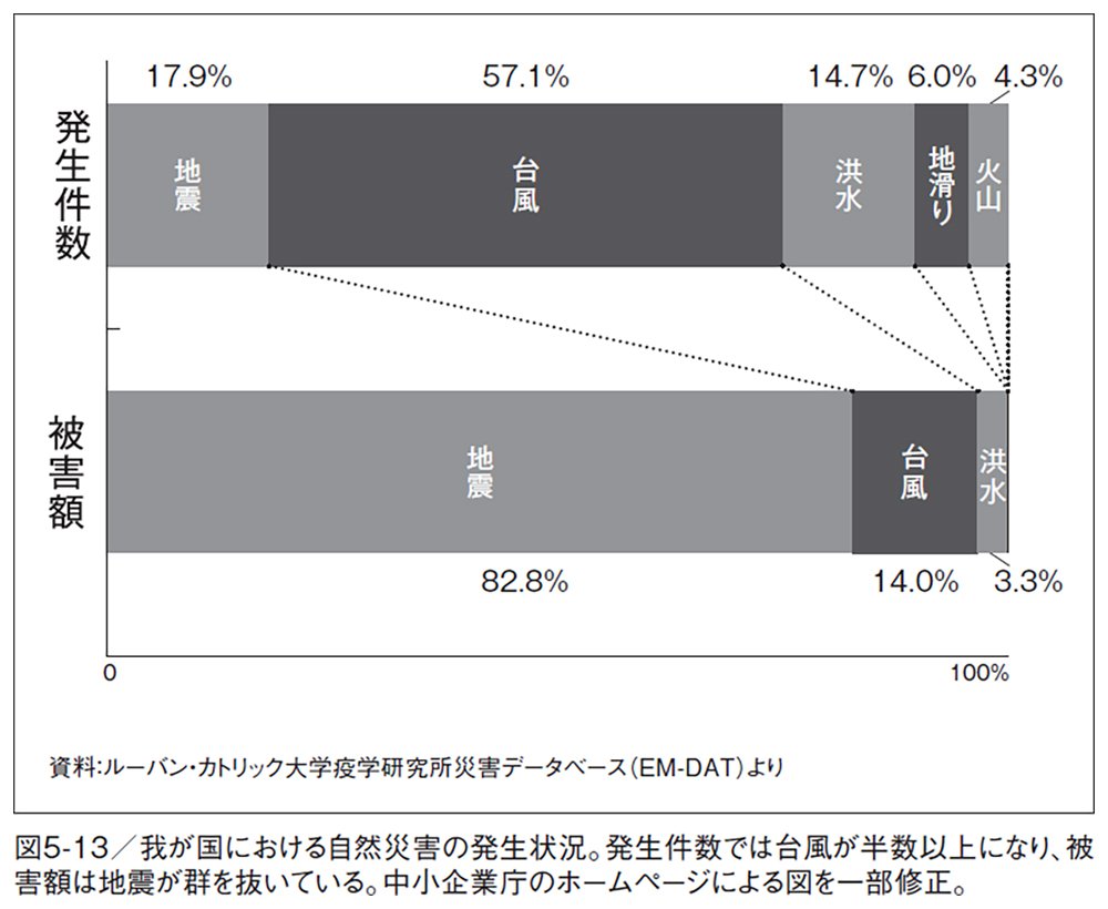 2019年版『中小企業白書』(中小企業庁)のデータによると、1985年から2018年の集計の結果、すべての自然災害のうち台風の占める割合は57.1%と群を抜いている(図5-13我が国における自然災害の発生状況)。