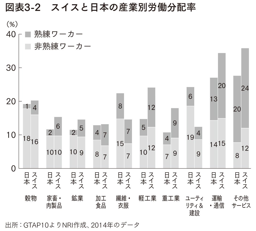 図表3-1で表現したように、スイスと日本の産業構造をチーズにたとえるなら、上から見たチーズの切れ目(GDPの産業別比率)は似ているが、横から見たチーズの厚み(収益率)はスイスの方が厚い、ということになる。