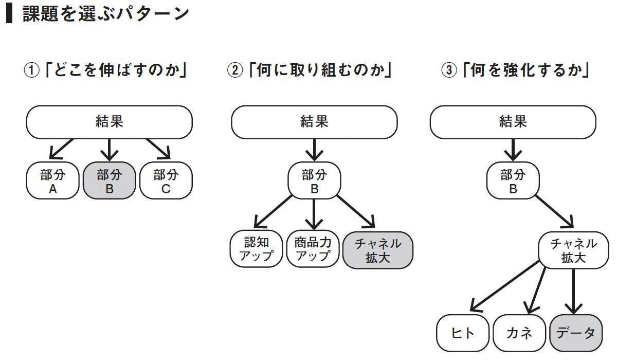 たとえば、「認知度アップに取り組むのか?」「商品力を高めるのか?」、それとも「チャネル拡大に取り組むのか」などを選びます。