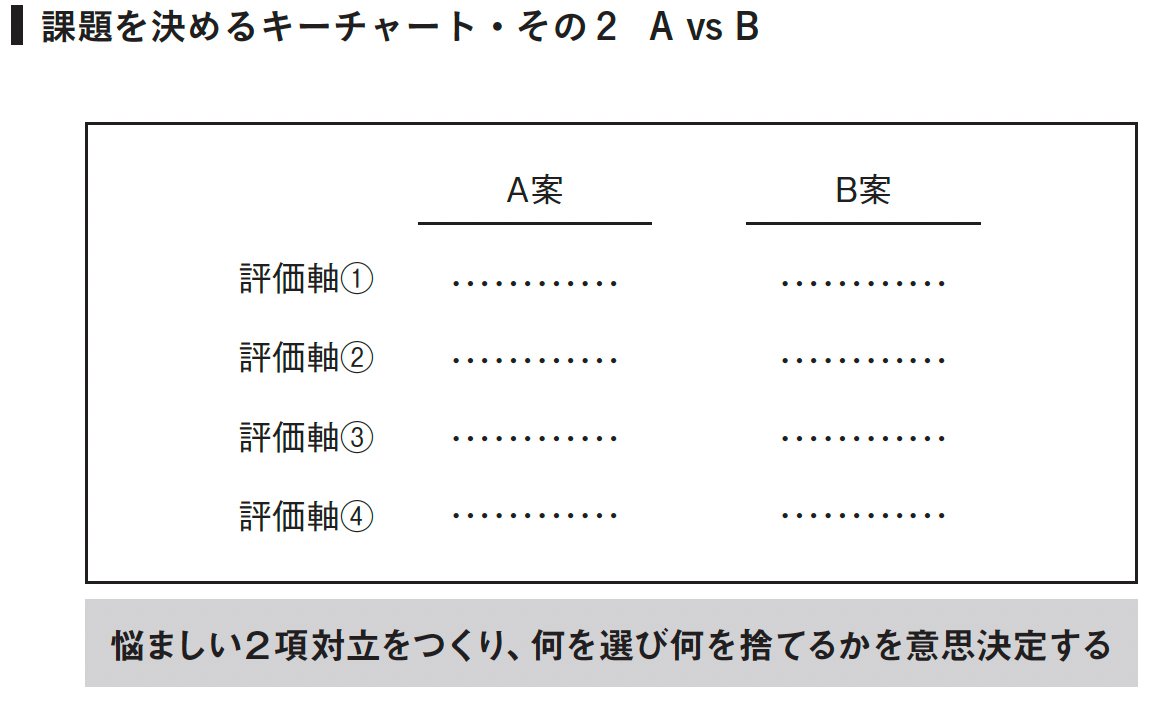 悩ましい2項対立をつくり、「何を選び」「何を捨てるのか」を意思決定します。