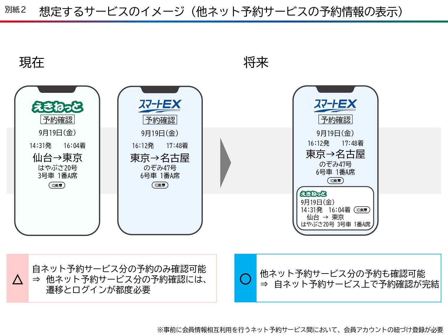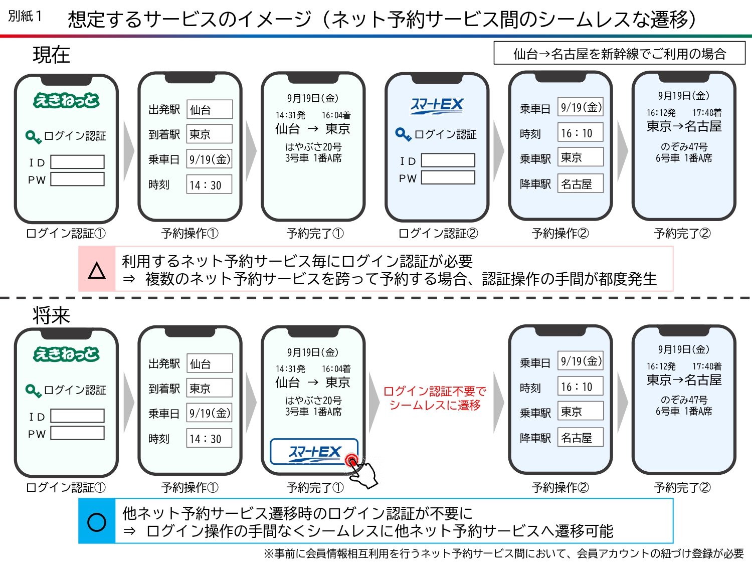プレスリリースに記された「想定するサービスのイメージ(ネット予約サービス間のシームレスな遷移)」には、仙台から名古屋まで新幹線を利用する場合、現在は「えきねっと」にログインし仙台~東京間を購入、続いて「EXサービス」にログインして東京~名古屋間を購入するが、連携後は「えきねっと」から「EXサービス」にログイン認証不要で直接遷移し、シームレスに購入できるとある。