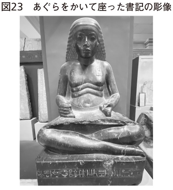 書記のほとんどは男性であった。読み書き能力は国の高官への道を自力で切り開く術であった。極端な話、勉強ができれば上流階級へと成り上がることができたのだ。それゆえ名声を享受したエリートである書記は、人々の憧れの的であり、称賛を集める存在であった。書記になった人々もそのことは自ら認めており、自身の膝にパピルスの巻物を置きながら、手に筆記用の筆を持ち、あぐらをかいて座る書記特有の姿勢で自身の彫像(下図)を作った。