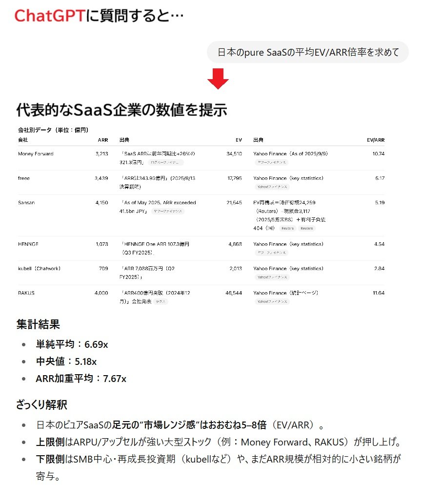 coco:月額3万円だと使用制限がなくて無限に使えるのと、GPT-5 Proという最新モデルで、普通のモデルではできない高度な分析もできます。例えば、ChatGPTには、「日本のピュアSaaSの平均EV/ARRは何倍ですか?」って聞いたりします。