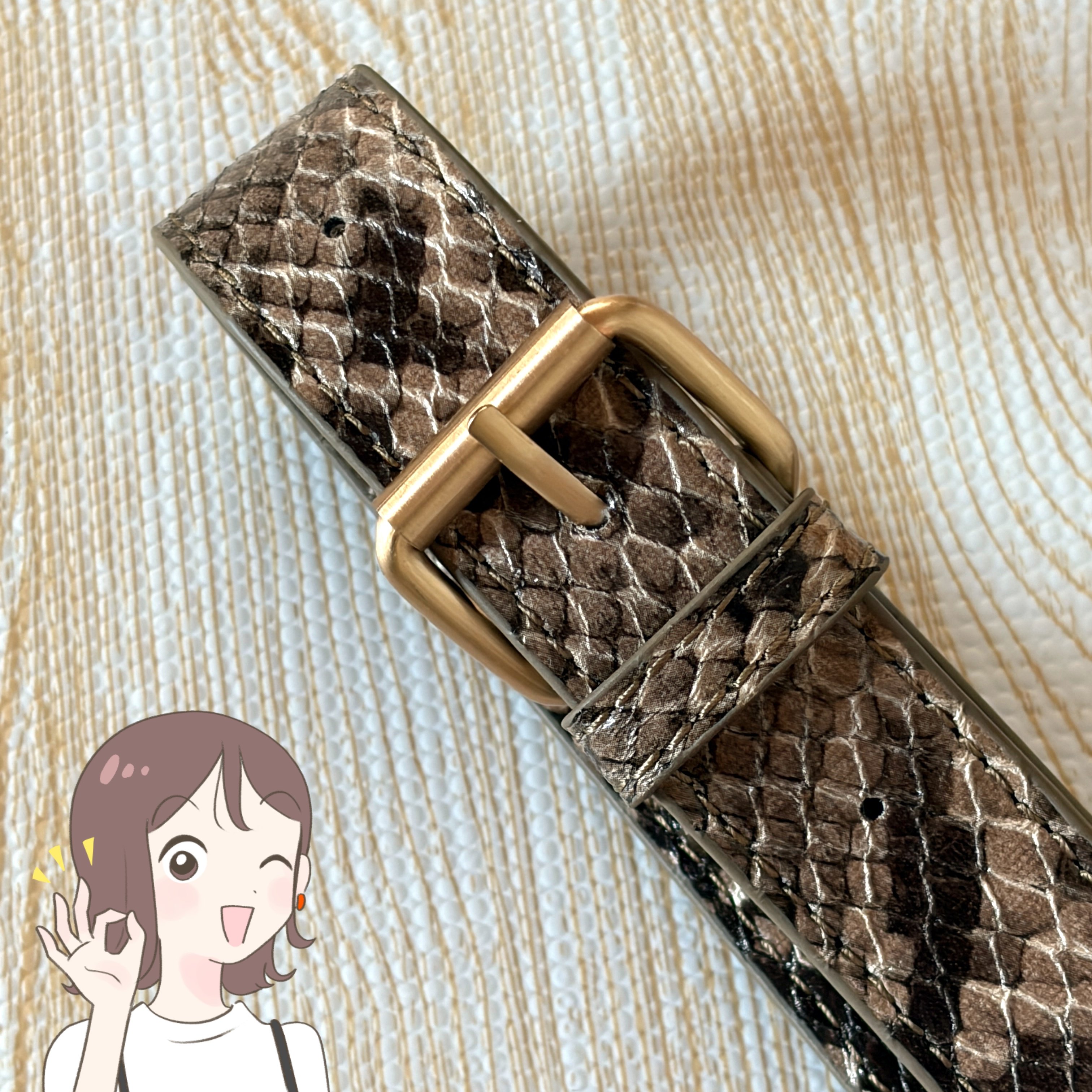 カラーはブラック、ベージュ、ブラウンの3色。今回選んだベージュは、パイソン柄(ヘビ柄)の模様が入っていて、パッと目を惹くデザインです。