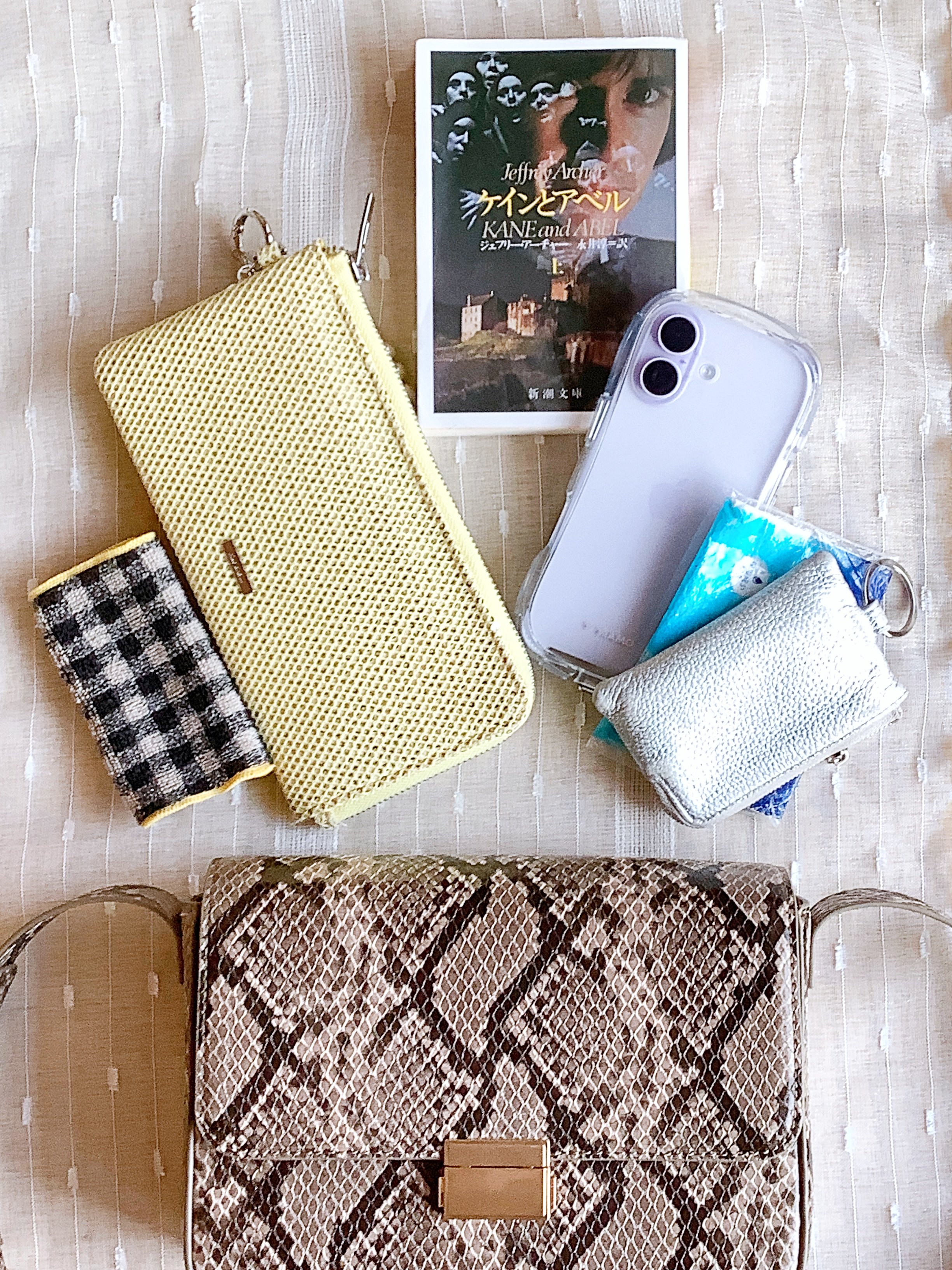 上品でコンパクトな見た目ですが、意外に荷物が入ります。長財布、スマホ、文庫本、タオルハンカチ、ティッシュ、キーケースを収納できました。