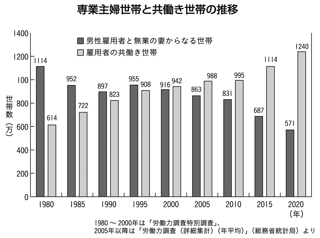 1980年と2020年を見ると、この40年で共働き世帯の両世帯に占める割合が倍増していることが分かる。令和の時代は、共働き世帯が「標準」なのである。