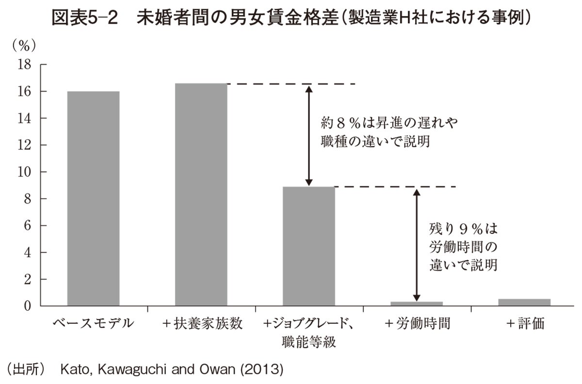 図表5-2は、かなり古いデータで恐縮だが、ある企業H社の2005年から2013年までの人事データをもとに回帰分析を用いて導出した、未婚の男女間の賃金格差だ。