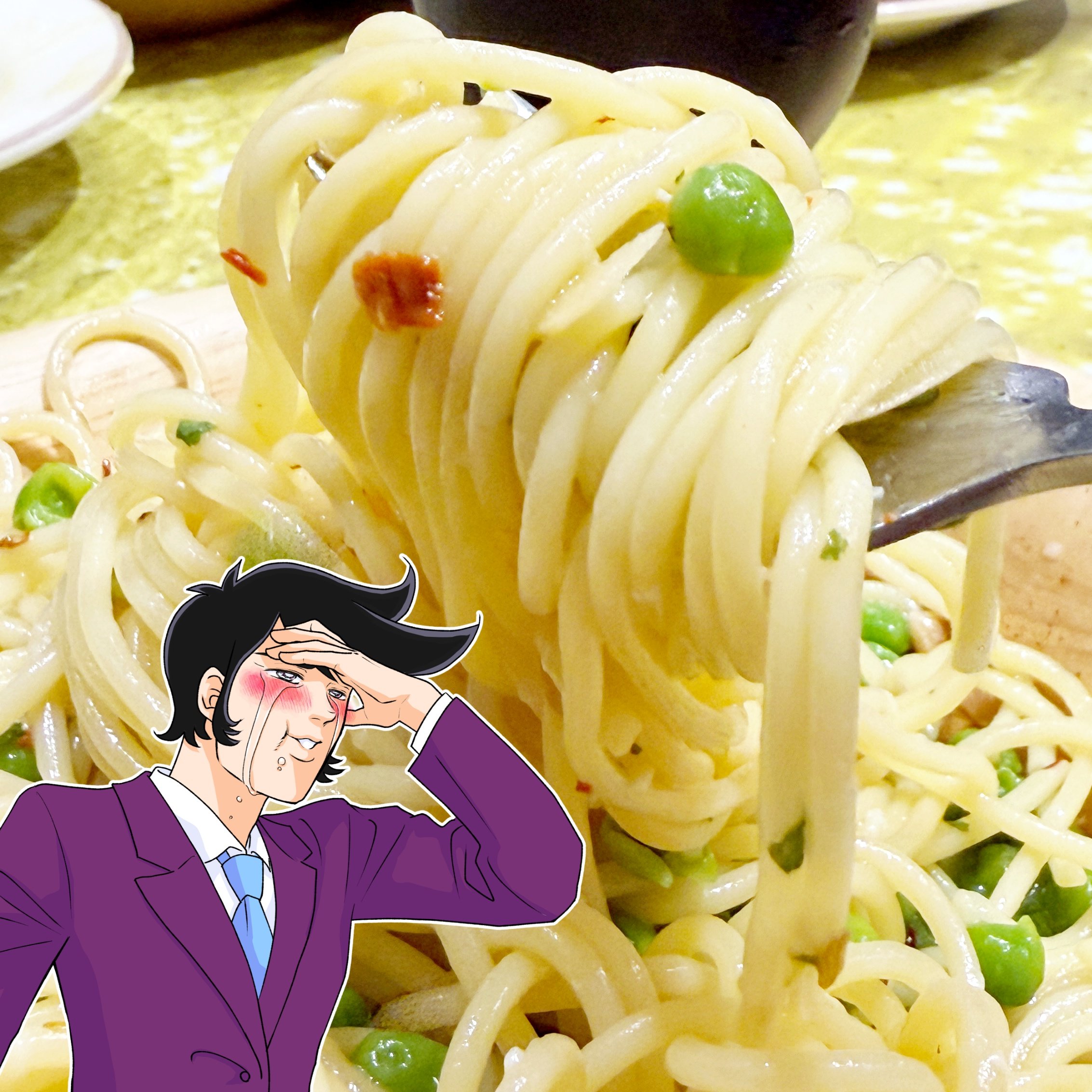 ペペロンチーノ(300円)を追加注文して青豆と混ぜてみたところ、ピリッと辛いペペロンチーノに青豆の風味が加わってウマい!青豆のほっこりした旨みで唐辛子の辛さが和らぎ、食べやすくなりました。