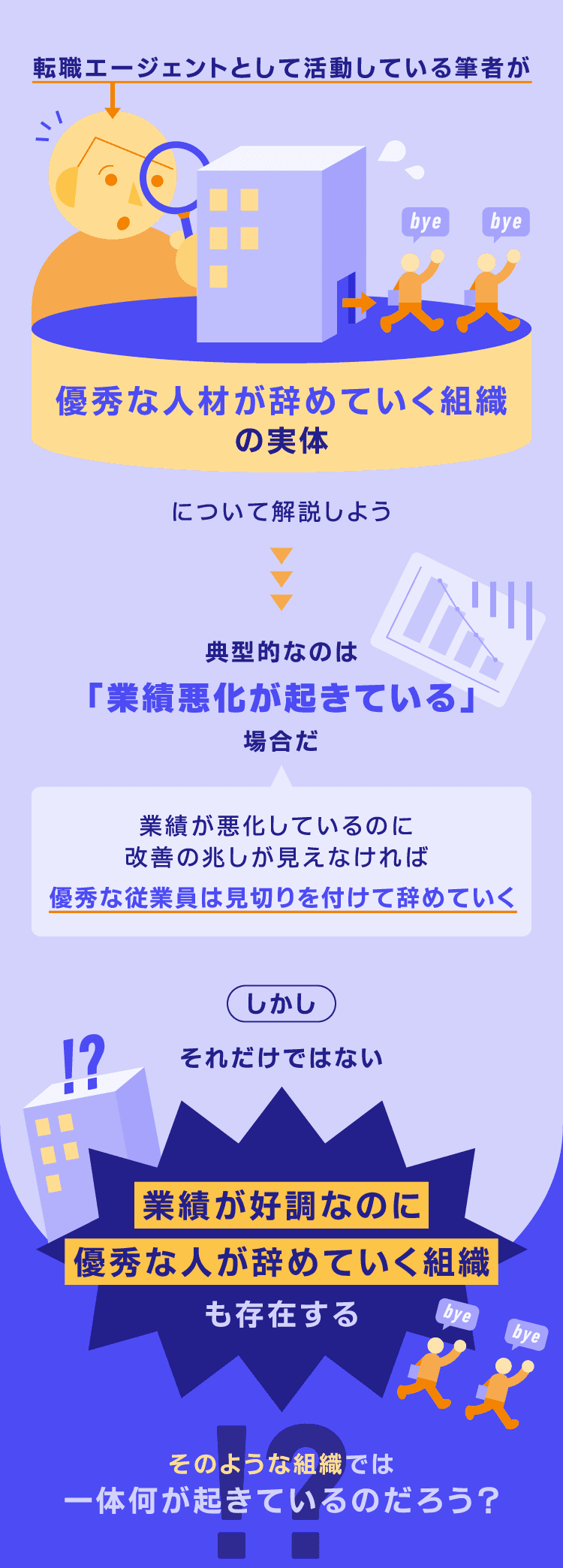 ビジネス、経済、経営、マネジメント、スキルアップ、キャリア、マネーなど、ビジネスパーソンに役立つ情報をイラストや視覚でわかりやすくお伝えする「グラフィックニュース」。今回は「優秀な人がどんどん辞める組織の共通点」について、2万人以上の転職を支援してきた転職のプロが解説します。 (著者 丸山貴宏/グラフィック制作 SmartNews)
