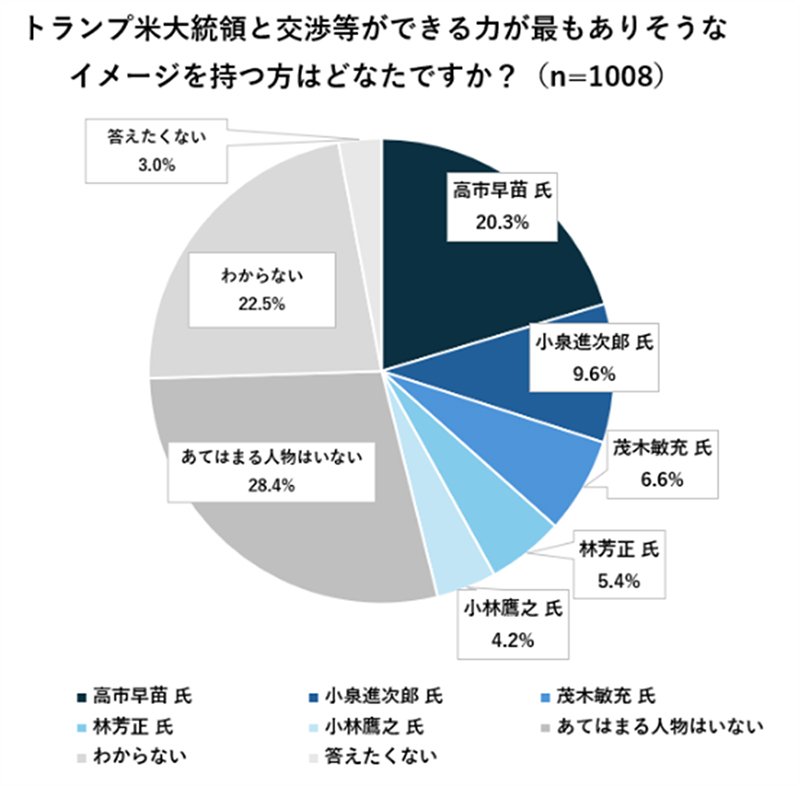 さらに「トランプ米大統領との交渉が最もできそうな人物は?」の問いでは、高市氏が20.3%でトップ、小泉氏(9.6%)、茂木氏(6.6%)と続きました。ただし、「あてはまる人物はいない」「わからない」の合計が過半数あり、総じて候補者全体に「交渉力がある」という印象は浸透していないことも明らかになりました。