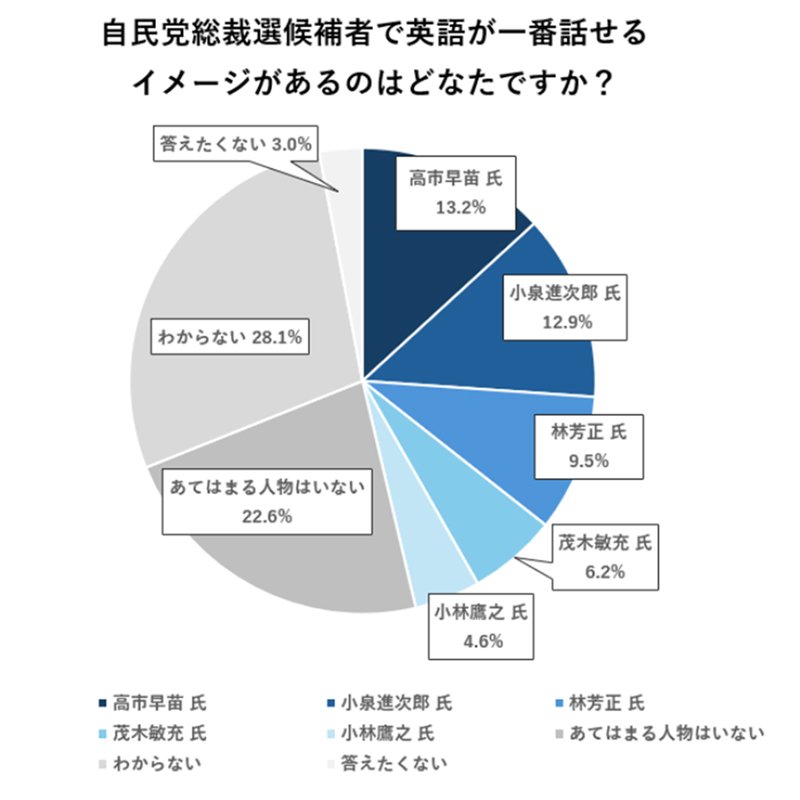 さて、弊社TORAIZ(トライズ)が実施した「総裁選候補者の英語力イメージ調査」(18歳~59歳の1008人が回答)の結果も紹介しましょう。自民党総裁選候補者5人の中で「最も英語を話せるイメージがある人物」を尋ねたところ、高市氏が13.2%で最多となり、小泉氏が12.9%で僅差の2位となりました。