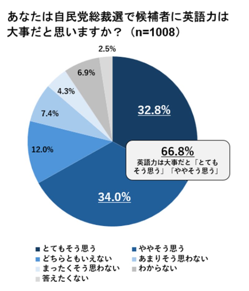 この調査では、そもそも「総裁選候補者に英語力は大事だと思うか」という質問もしています。結果は、「とてもそう思う」「ややそう思う」が計66.8%と、英語力が重視されていることが分かります。