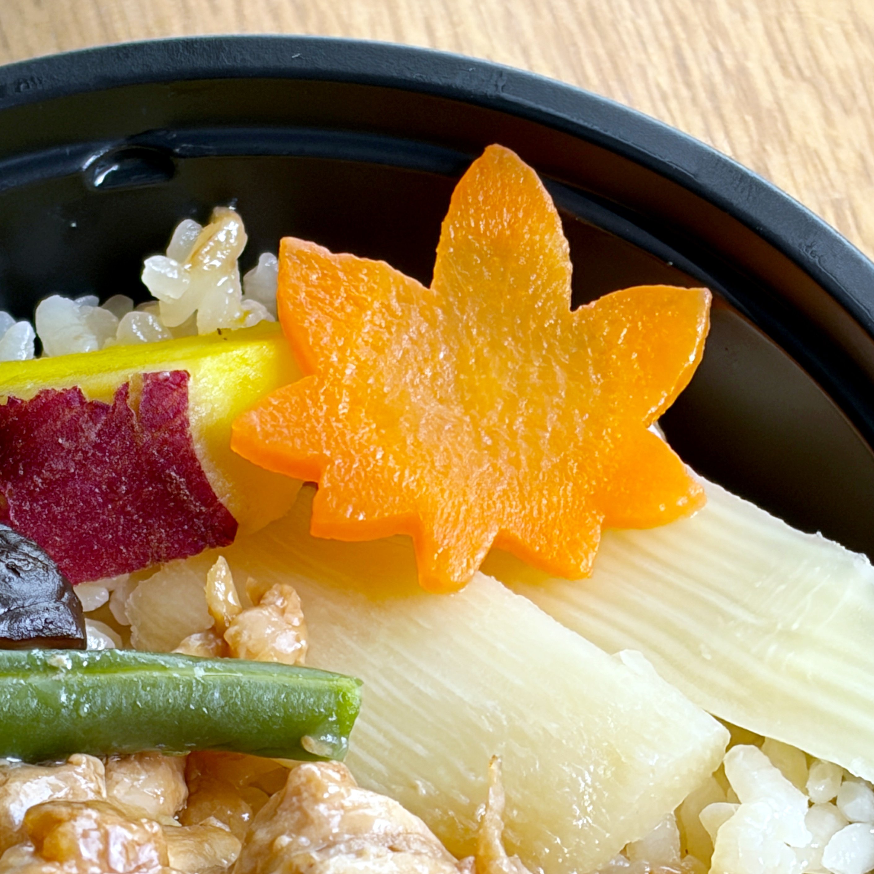 ニンジンが紅葉の形にカットされていてかわいい。さつまいもやキノコも入っていて、秋の訪れを感じました。