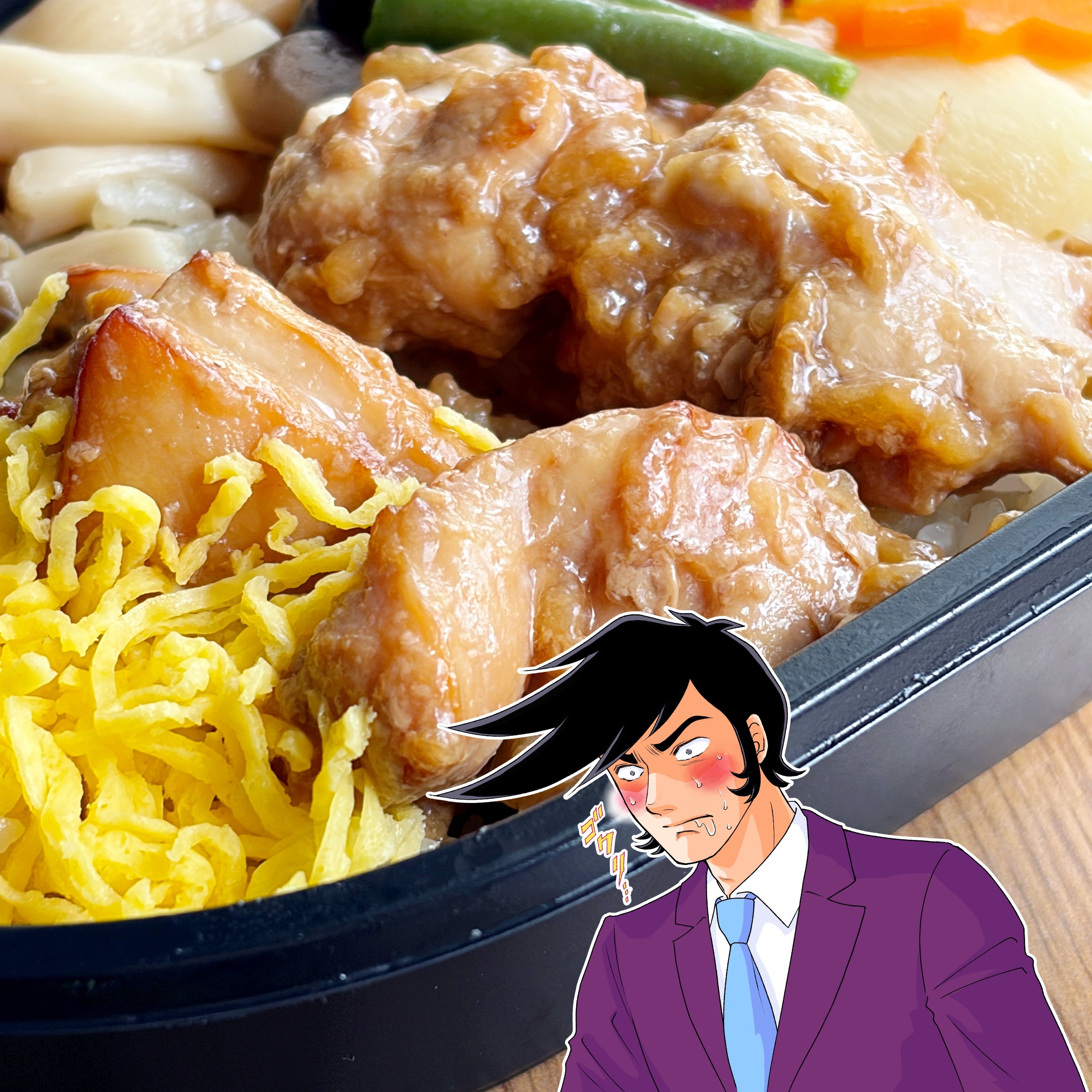秋の味覚が詰まった季節感たっぷりのお弁当です。おかずは鶏肉と錦糸玉子、ニンジン、たけのこ、さつまいも、インゲン、しめじ、しいたけ、かまぼこと盛りだくさん。彩り豊かで目を奪われます。