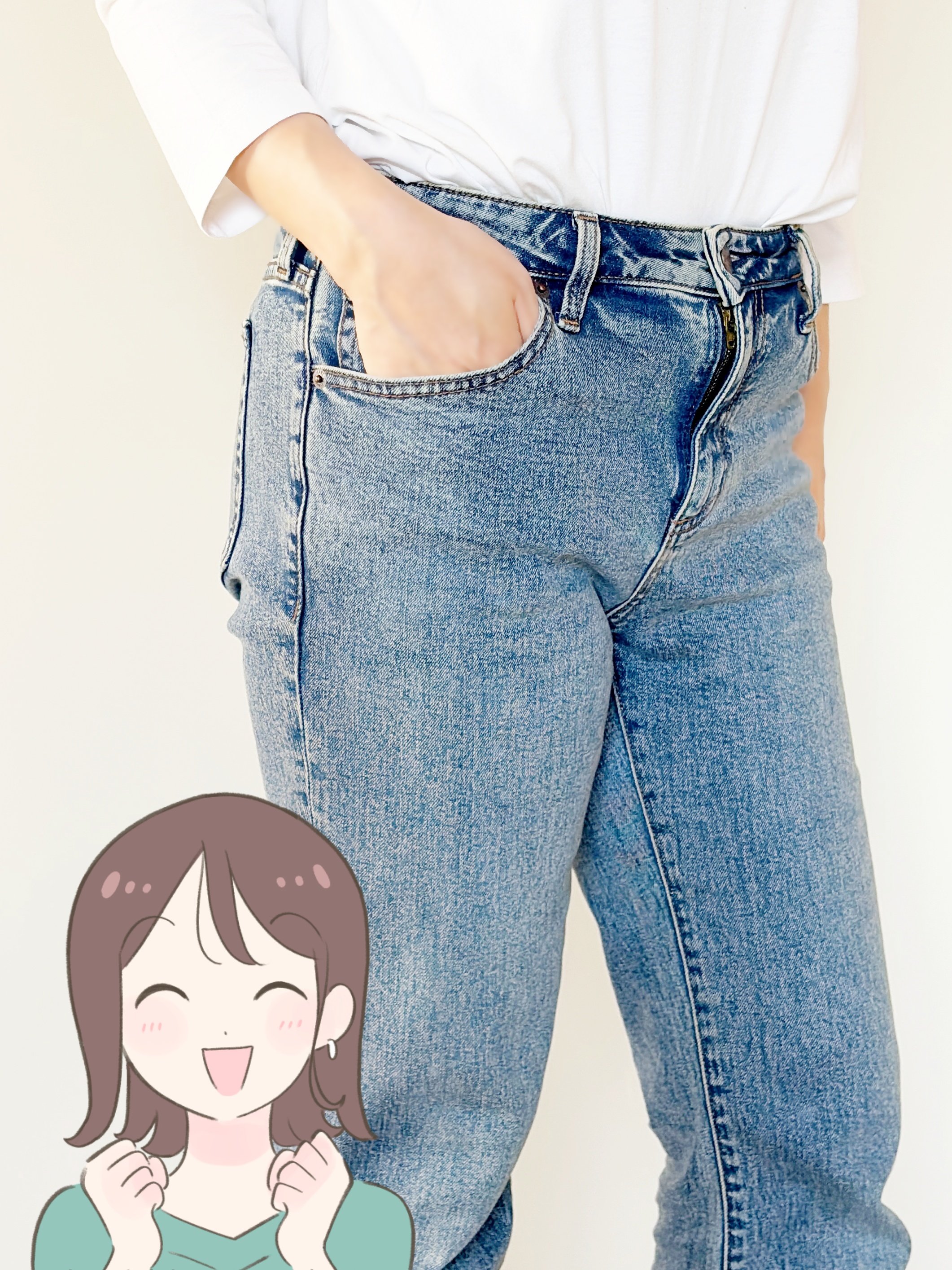 65ブルーは明るすぎず暗すぎない色味で一年中使えそうです。古着のような色落ち感が今っぽくて、コーデに抜け感をプラスしてくれます。