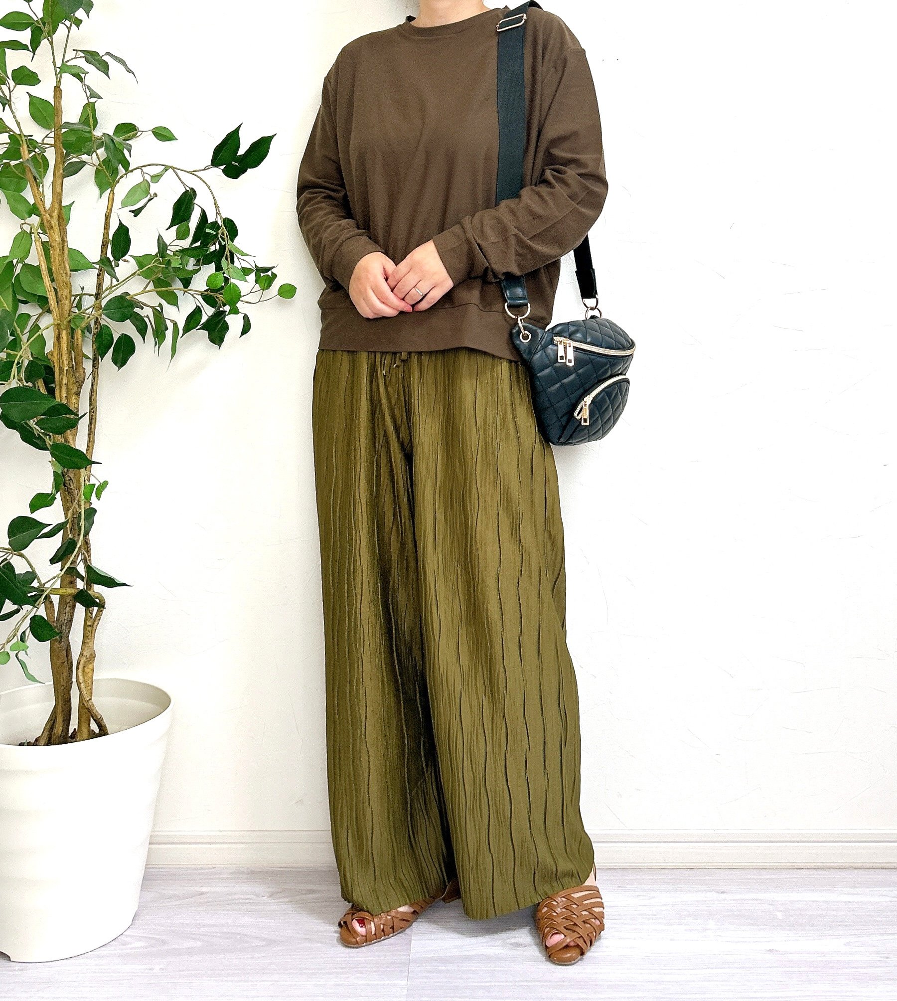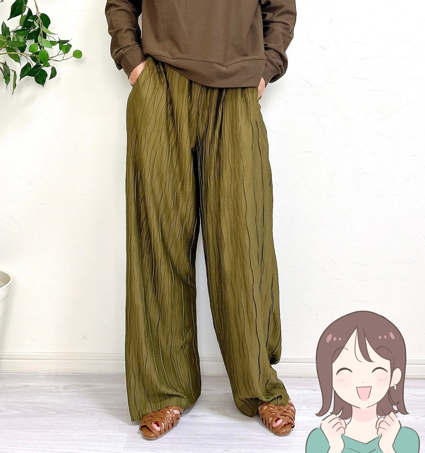 凸凹したプリーツがオシャレなゆったりパンツです。価格は1690円。キレイ見えするのに、まるで何もはいてないくらい軽くてはき心地バツグン!購入したカーキ色は、ほんのり光沢感があってとても上品です。