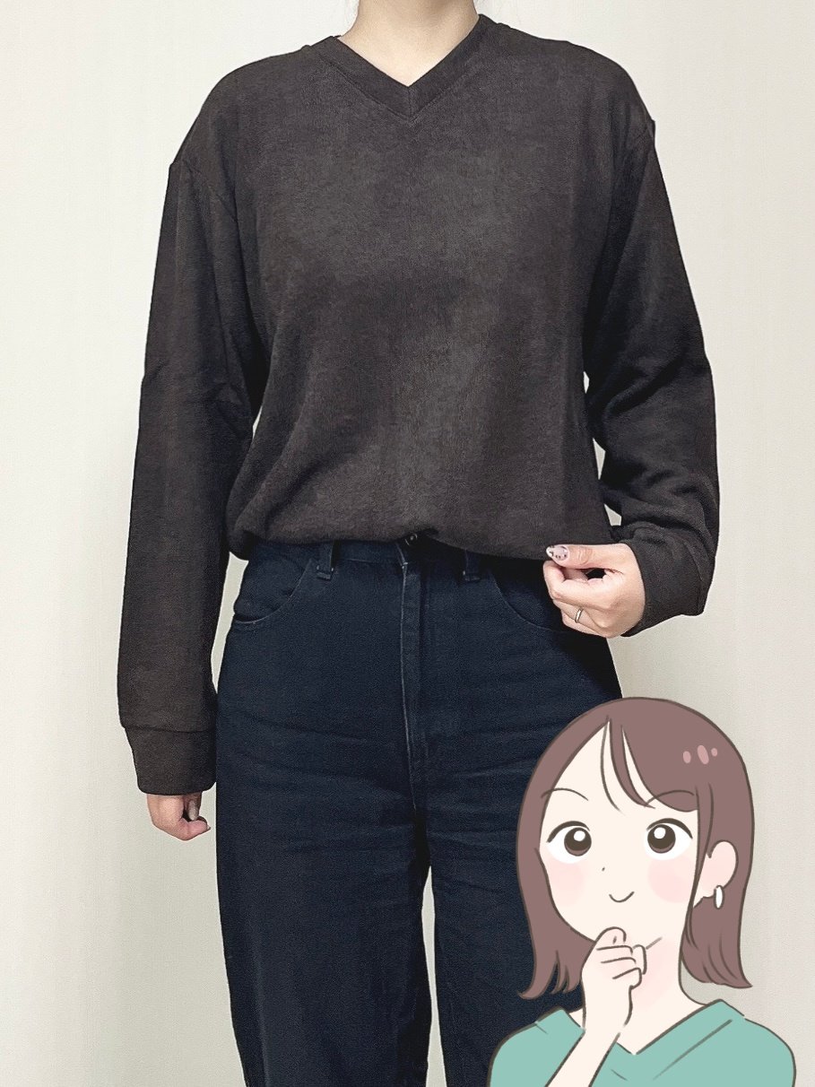 首元はVネックになっていて、顔周りがスッキリ見える!Vネックが深すぎないので1枚でもサマ見えします。