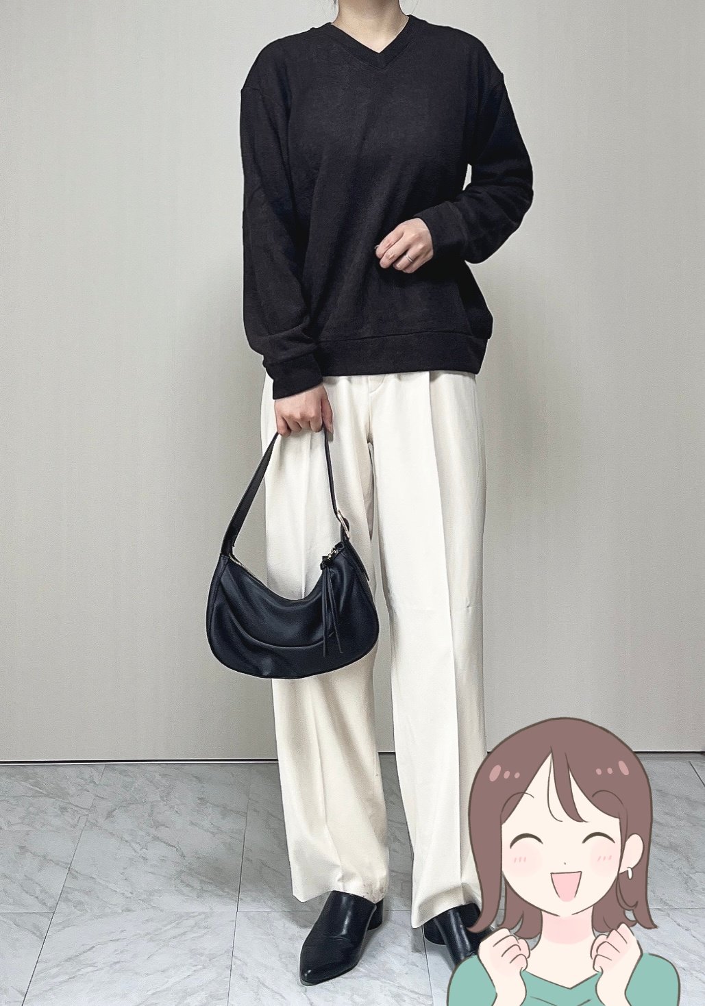 ホワイトのワイドパンツと合わせると、オフィスに着ていけるようなキレイめコーデが完成します。オンオフたっぷり着回せて、色違いも欲しくなりました!