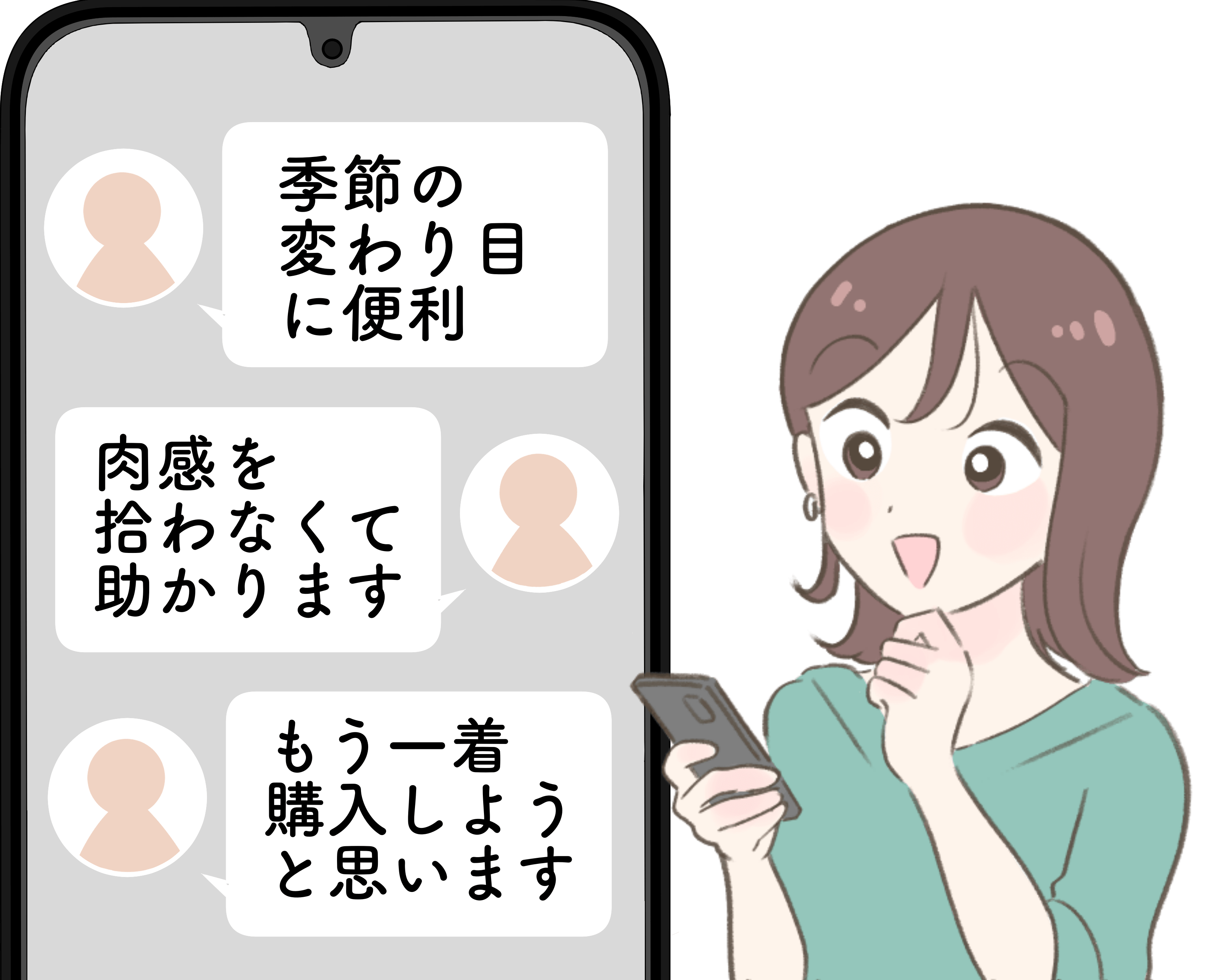 公式サイトの商品レビューには「季節の変わり目に便利」「厚手でしっかりした生地なので肉感を拾わなくて助かります」「スカートでもデニムでもよく合います」「コンパクトなシルエットなので野暮ったくなりません」「もう一着購入しようと思います」といった声が投稿されていました。