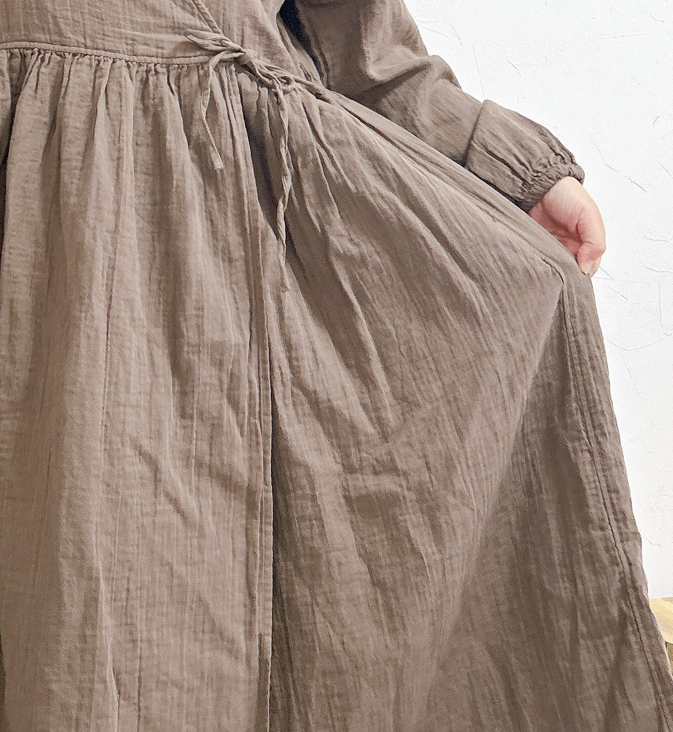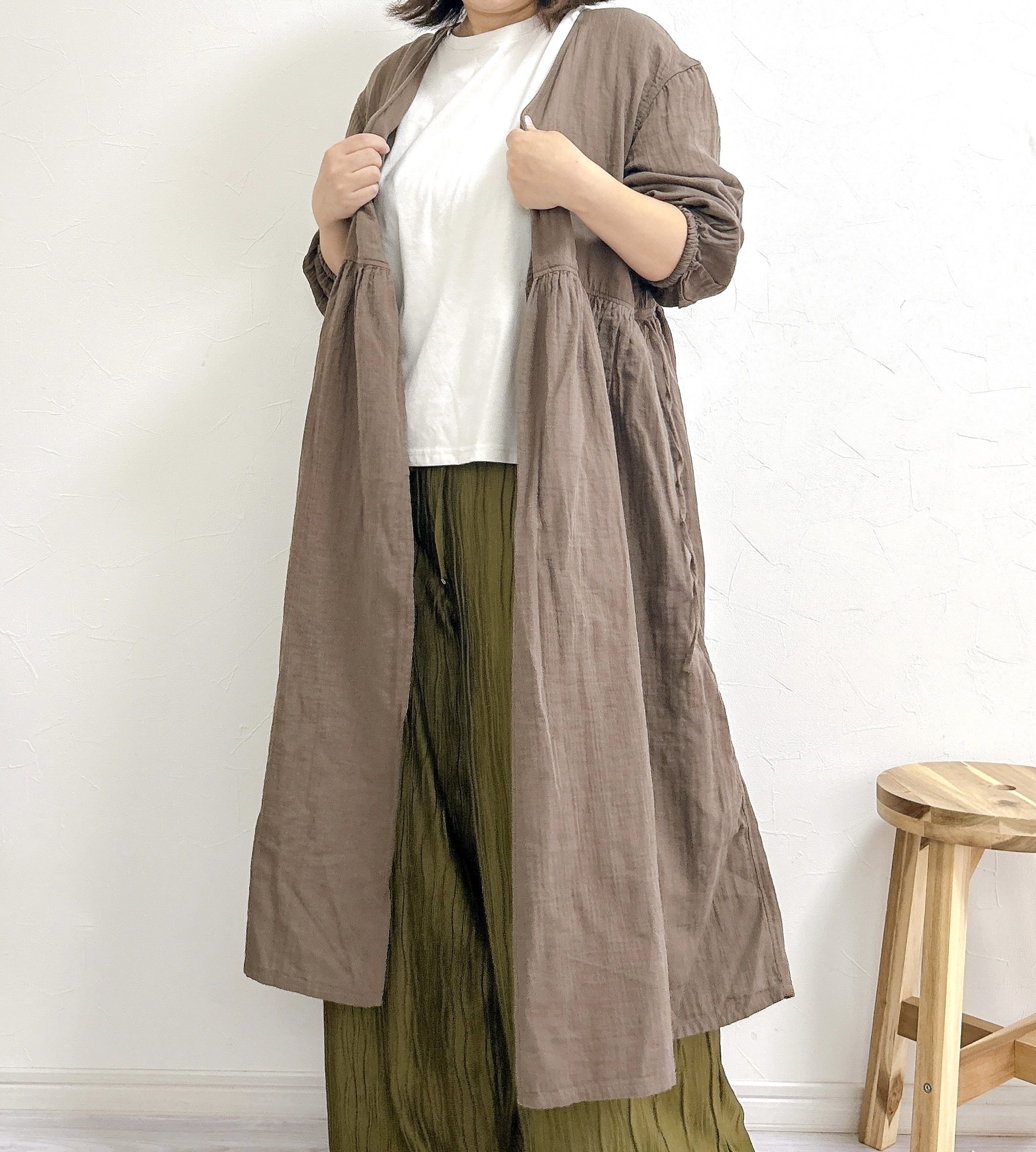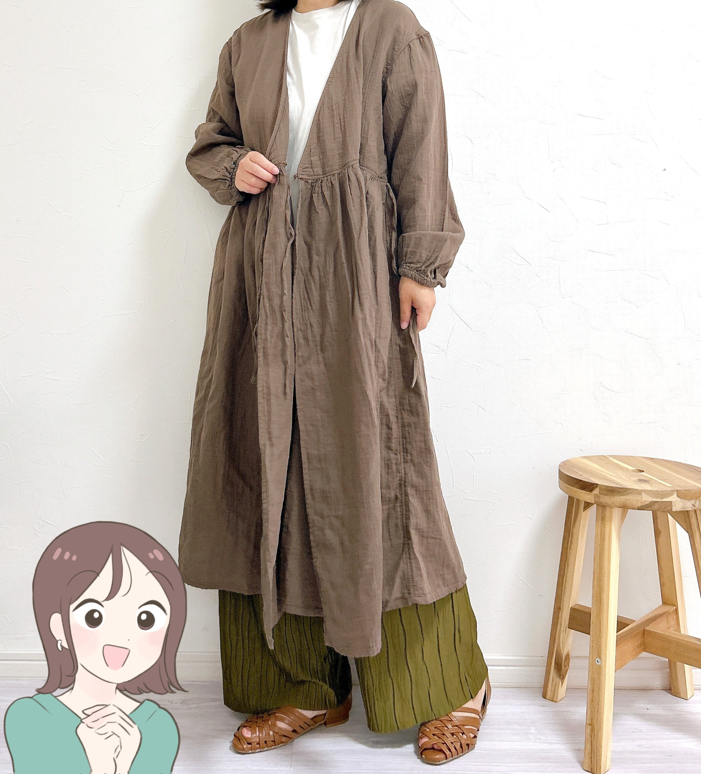 ふんわりしたやわらかい肌触りのロング丈カーディガンです。公式サイトによると、オーガニックコットンの二重ガーゼの生地を使用。リラックス感のある着心地が楽しめます。