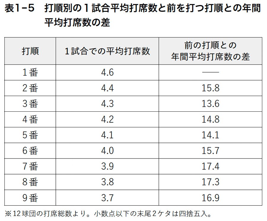 しかし、大きなデメリットがあります。ここで2024年のセ・リーグとパ・リーグを合わせた打順別の1試合平均打席数と、前を打つ打順との平均打席数の差を調べてみました(表1-5)。